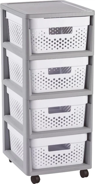 Regał Infinity to praktyczne i stylowe rozwiązanie do przechowywania, idealne do każdego wnętrza. Wyposażony w 4 wyjmowane pojemniki, pozwala wygodnie organizować różne przedmioty. Prosty, nowoczesny design inspirowany stylem skandynawskim pasuje do wielu aranżacji, a uchwyty i kółka ułatwiają użytkowanie. Łatwy w czyszczeniu i wykonany w co najmniej 70% z tworzywa z recyklingu, jest przyjazny dla środowiska.