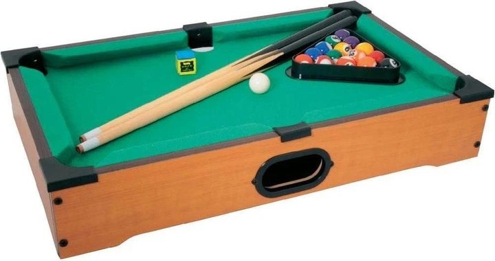 У комплекті є всі необхідні аксесуари: 2 більярдні киї, набір куль, трикутник для їх установки та крейда. Завдяки цьому гра готова до використання відразу після розпакування. Дерев'яна конструкція забезпечує стабільність та естетичний вигляд, який добре поєднується з інтер'єром кімнати.