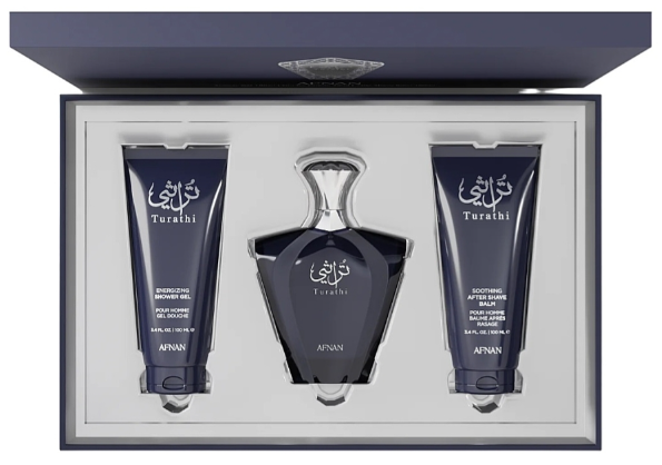 Набір Afnan Perfumes Turathi Blue — це можливість відчути багатогранне звучання східного пряного аромату для чоловіків одразу у 3-х засобах. Лосьйон після гоління та гель для душу доповнюють своїм запахом звучання парфумованої води. Сама композиція доволі глибока та прониклива. Вона будується на відчуттях сили і вишуканості водночас. Тож найкращим тлом для неї стає мускус, який іскриться східними спеціями. Амбра і деревина додають справжніх мужніх акордів, в той час, як цитрусові ноти пробуджують нестримну енергію аромату.
