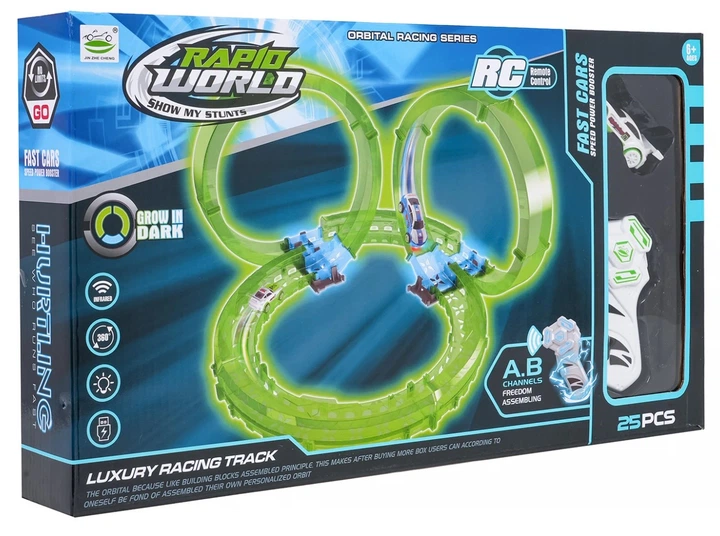Великий автомобільний трек, який світиться в темряві, – відмінний вибір для дітей від 6 років. У комплект входять пульт, машинка та елементи конструкції треку.
