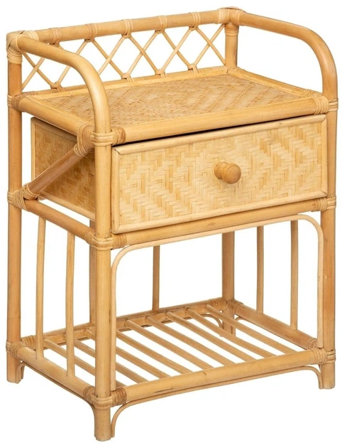 Stolik rattanowy do sypialni AONI, z szufladą i półką to tak uroczy mebel, że trudno oderwać od niego wzrok. Smukła bryła, blat, szuflada z plecionki i rattanowa podstawa to idealny baza do zdjęć oraz dopełnienie wnętrza boho.