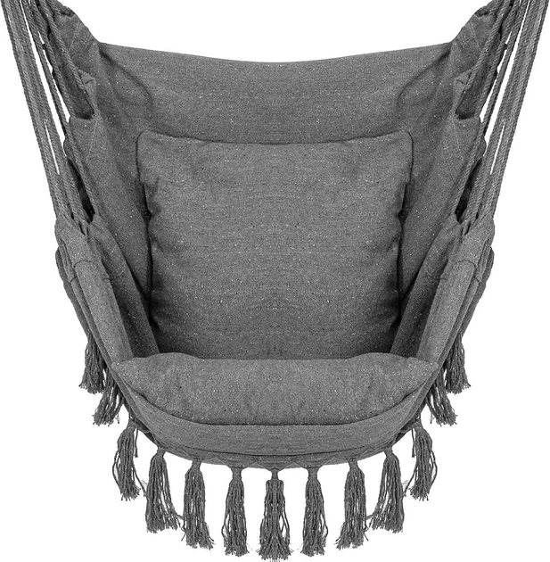 Підвісне крісло-гойдалка Springos HM060 — це стильне та комфортне місце для відпочинку, яке поєднує естетику бохо та практичність бразильського гамака. Виготовлене з м’якої та міцної суміші бавовни (65%) і поліестеру (35%), воно забезпечує приємні тактильні відчуття та довговічність, а дерев’яна розпірка довжиною 100 см зі спеціальними пазами гарантує стабільність і безпечне кріплення мотузок. Сірий колір і декоративна бахрома 15 см роблять гамак стильним елементом інтер’єру чи садового простору, а дві подушки 45×45 см додають ще більше комфорту. Крісло витримує навантаження до 150 кг, має бічну кишеню для дрібниць і регульовані бічні шнури довжиною від 30 до 70 см, що дозволяє легко налаштувати висоту підвішування. Завдяки розмірам сидіння 100×126 см та міцному дерев’яному каркасу це крісло-гойдалка стане ідеальним місцем для релаксу вдома, на балконі, терасі чи в саду.