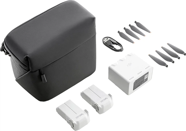 DJI Mini 3 Pro Fly More Kit включає дві інтелектуальні польотні батареї, двосторонній зарядний концентратор, кабель для передачі даних, наплічну сумку, запасні пропелери та гвинти, забезпечуючи всебічну підтримку для аерозйомки.