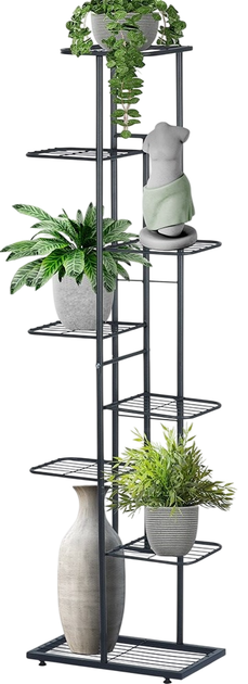 - ЕФЕКТНИЙ - Восьмиповерховий квітник, який дозволяє зберігати горщики або декорації на восьми різних рівнях. Зовнішні розміри квітника становлять 44 x 22 x 142 см. Максимальне навантаження на одну полицю становить 3 кг, а на весь квітник - 27 кг. Нижня полиця має прямокутну форму і розміри 41 x 22 см, на ній можна розмістити два горщики. Решта полиць мають розміри 22,5 x 19 см, а верхня полиця має розміри 24 x 21,5 см.