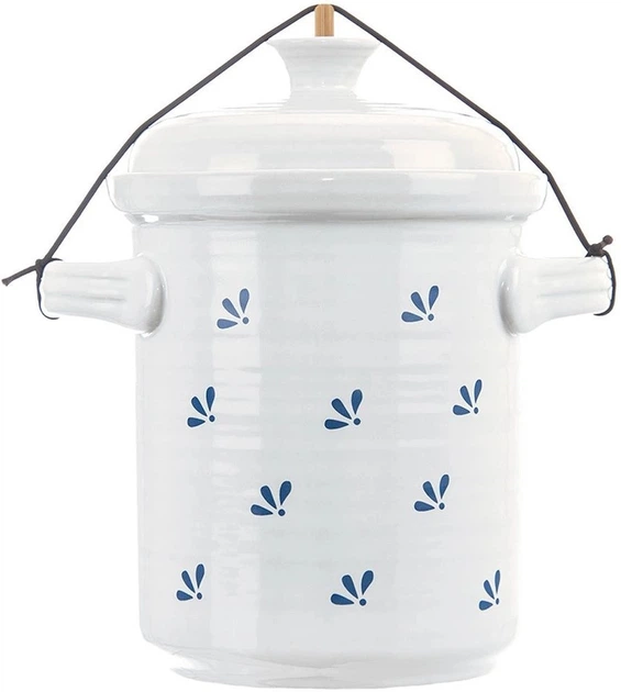 Pojemnik Orion ModroBila do kiszenia ogórków, kapusty lub innych warzyw. Wykonany z wysokiej jakości białej ceramiki z niebieskim wzorem. Garnek wykonany jest z glazurowanej, nieprzezroczystej ceramiki, która pomaga utrzymać stałą temperaturę produktów, zapewniając lepsze warunki do dojrzewania i zachowania smaku. Pojemnik posiada pokrywkę, która szczelnie zamyka pojemnik, a także wewnętrzną pokrywkę, która za pomocą uchwytu i gumki stale dociska warzywa do dna i wywiera na nie nacisk. Ten pojemnik ma wiele zastosowań w kuchni. Idealnie nadaje się do konserwowania produktów w domu, takich jak ogórki kiszone, ryby marynowane, sery i inne przysmaki konserwowane w oleju, zalewie lub occie. Pojemnik ma dwa uchwyty ułatwiające przenoszenie. W pokrywie znajduje się otwór w uchwycie do dodawania wody, co zapewnia prawidłowe fermentowanie bez konieczności zdejmowania pokrywy.