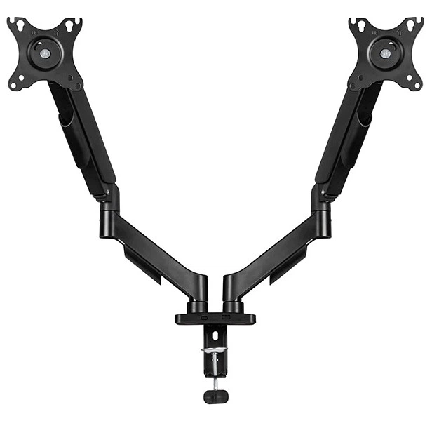 Uchwyt został zaprojektowany specjalnie z myślą o zainstalowaniu dwóch monitorów na biurku. Uchwyt został wykonany z wysokiej jakości metalu oraz tworzywa w kolorze czarnym. Idealnie sprawdzi się zarówno w domu jak i w biurze.