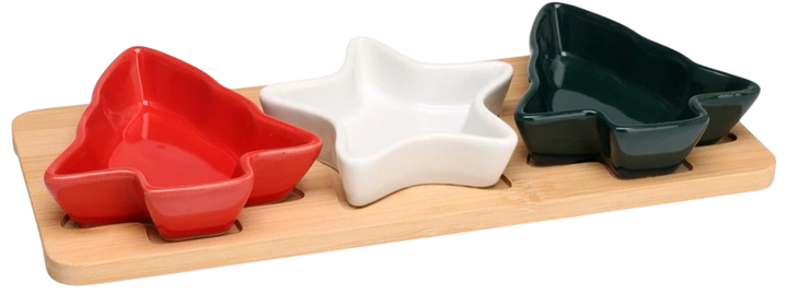 Набір для подачі закусок з підносом - 4-елементний набір для подачі, що складається з трьох чашок: двох у формі ялинки та однієї у формі зірки, а також прямокутного підносу. Ідеально підходить для елегантної подачі горіхів, оливок, соусів та інших дрібних закусок під час святкових зустрічей. Піднос разом з мисочками має розміри 28.5 x 12.5 x 3.5 см. У комплекті: 2 мисочки у формі ялинки розмірами 12 x 10 x 3 см і місткістю 70 мл та у формі зірочки розмірами 11 x 8.5 x 4 см і місткістю 50 мл.