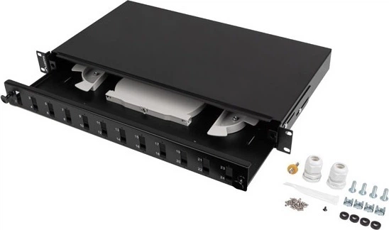 Przełącznica światłowodowa wysuwana z akcesoriami montażowymi o wysokości 1U to produkt przeznaczony do montażu wewnątrz szaf teleinformatycznych o szerokości 19". Wykonana została w całości z wytrzymałej blachy stalowej lakierowanej proszkowo.