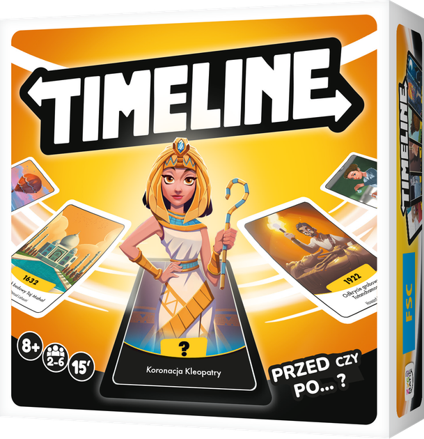 Jak sądzisz, co zostało wynalezione najwcześniej: szczoteczka do zębów, zegarek, a może teleskop? Który z cudów świata starożytnego zaczął być budowany najpóźniej? Czy ołówek we współczesnej formie jest z nami dłużej niż zapałki? Na te i inne pytania odpowie Timeline – niezwykle przyjemna karcianka dla całej rodziny, w której wspólnie tworzymy oś czasu z wylosowanych kart wydarzeń. W pudełku znajdziesz 96 kart z historii ogólnej, od prehistorii aż po współczesność.