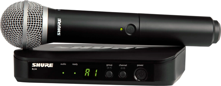 Комплект включає приймач BLX4 та ручний передавач BLX з мікрофонним капсулем PG58 . Передавач BLX оснащений популярним мікрофонним капсулем, міцним та надійним корпусом з ABS-пластику, подушкою з шумопоглинанням 10 дБ, ергономічною кнопкою ввімкнення/вимкнення та одноколірним світлодіодним індикатором заряду батареї. Приймач BLX4 — це бездротовий приймач напіврейкового розміру в міцному корпусі з ABS-пластику. Він пропонує функції, які зазвичай не зустрічаються в бездротових системах цього цінового діапазону. Капсул PG58 — це популярний динамічний капсуль з кардіоїдною діаграмою спрямованості, дизайном середньої цінової категорії та високою якістю звуку.