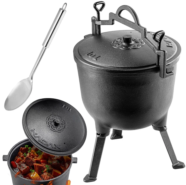 Чавунний казанок чудово підтримує температуру страв, забезпечуючи їх рівномірне приготування. Він стійкий до механічних пошкоджень, таких як подряпини або тріщини. Три стабільні відгвинчувані ніжки дозволяють безпечно встановити посуд над вогнищем, а також полегшують його зберігання та транспортування.