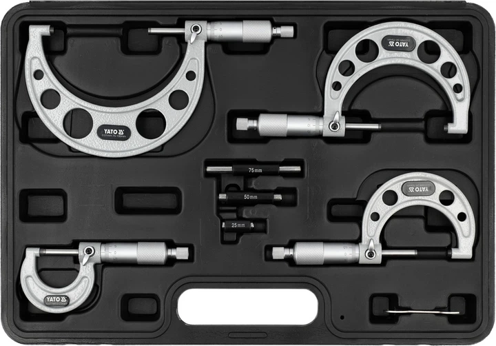 Набір із чотирьох зовнішніх мікрометрів – це високоякісні вимірювальні інструменти, призначені для точного визначення зовнішніх розмірів деталей із малими допусками. Вони чудово підходять для механічних майстерень, вимірювальних лабораторій та контролю якості, де потрібна висока точність і повторюваність результатів. Це ідеальне рішення для фахівців, які цінують точність, надійність та зручність у щоденній роботі.