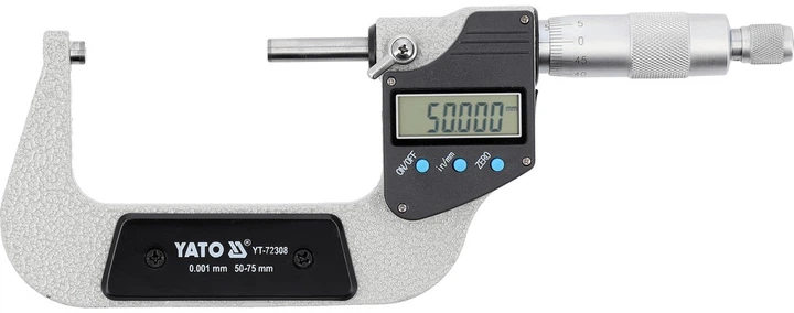 Мікрометр Yato YT-72308 цифровий зовнішній 50-75 мм / 0.001 мм (5906083122361). Цифровий зовнішній мікрометр (тип A) — це висококласний вимірювальний інструмент, призначений для точного визначення зовнішніх розмірів деталей із малими допусками. Застосовується в механічних майстернях, вимірювальних лабораторіях та під час контролю якості, де потрібні найвища точність і повторюваність результатів. Ідеально підходить для фахівців, які цінують точність, надійність і зручність у щоденній роботі.