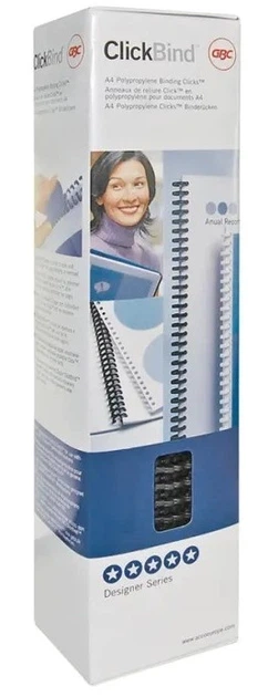 Bindowanie nie może być prostsze! Grzbiety GBC ClickBind - przeznaczone do oprawy dokumentów w systemie ClickBind, choć można je również stosować do oprawy w systemie WireBind - nadają oprawie elegancki styl oraz zabezpieczają dokument przed uszkodzeniami. W oprawionych dokumentach można błyskawicznie dodawać lub usuwać strony przy użyciu prostego narzędzia, można też otwierać je na płasko, co ułatwia kserowanie.