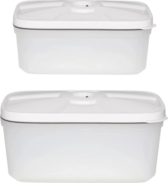 Praktyczne pojemniki: W zestawie dwa pojemniki o wymiarach 15 x 21 x 10 cm, idealne do przechowywania różnych produktów spożywczych. Dzięki próżniowemu pakowaniu produkty pozostają świeże na dłużej. Pompka odsysająca nie jest dołączona do zestawu.