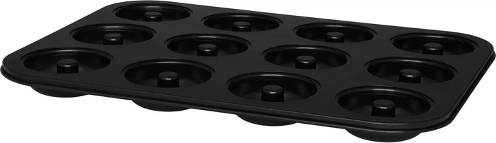 Форма розміром 26,5 × 35,5 × 2,5 см дає змогу одночасно випікати 12 пончиків, що ідеально підходить для сімейних зустрічей, свят або приготування десертів про запас. Виготовлена з високоякісної вуглецевої сталі, вона безпечна для контакту з харчовими продуктами та забезпечує рівномірне пропікання.
