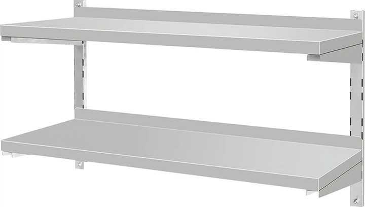 Регульована, подвійна полиця YATO із заднім бортиком. Бортик захищає від потрапляння забруднень між полицею та стіною. Виготовлена з високоякісної нержавіючої сталі, яку легко очищати.