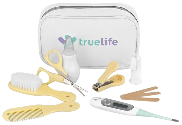 Повний набір для догляду за дитиною – дорожній футляр, ножиці, кусачки для нігтів, пилочки для нігтів, щітка для волосся з тонкою щетиною, гребінець, зубна щітка для пальців, відсмоктувач слизу, Термометр TrueLife Care T3 – 5-секундне вимірювання, гнучкий наконечник, триколірний дисплей.