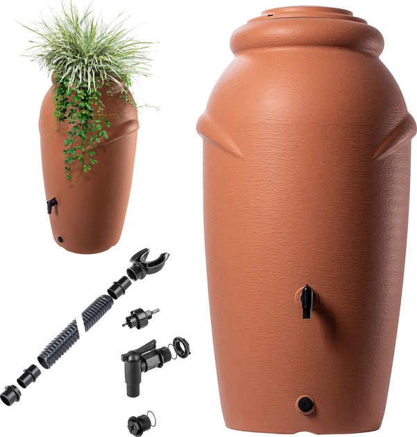 Повний комплект – резервуар постачається з роз'ємами, краном та підставкою, які завдяки інтуїтивно зрозумілому дизайну легко встановлюються. Встановлення швидке та просте, тому ви можете насолоджуватися повною функціональністю вашого резервуара без потреби в додаткових інструментах чи професійній допомозі. Турбота про нашу планету – це не лише модне слово, а й необхідність у наші дні. Все більше людей усвідомлюють необхідність захисту довкілля. Резервуар для дощової води – це відповідь на ці виклики. Натхненний стародавнім мистецтвом, він надає йому унікального характеру, який покращить вигляд будь-якого саду. А завдяки доступним варіантам кольору та місткості ви можете легко налаштувати його відповідно до своїх індивідуальних потреб та простору.