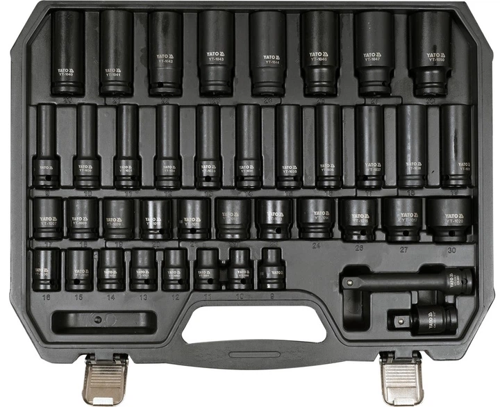 Набір ударних головок Yato YT-10555 1/2" 40 елементів (5906083104404). Відкрийте для себе міцність набору ударних насадок YT-10555. Це професійний інструмент, створений для найвимогливіших завдань у сервісі та промисловості.