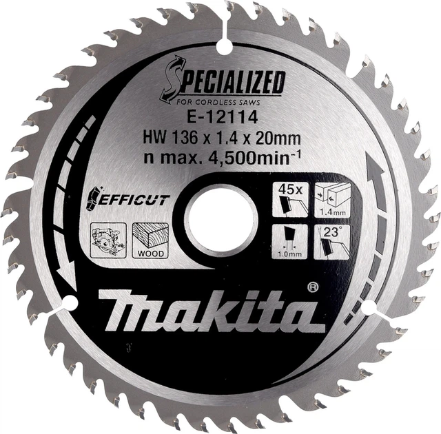 Ріжучий диск Makita EFFICUT T.C.T 136 мм 45Z (E-12114) — це високоефективне рішення, призначене головним чином для акумуляторних дискових пил, створене для швидкого та точного різання деревини. Застосування технології EFFICUT та карбідних зубців T.C.T дозволяє значно зменшити опір різання, що безпосередньо перекладається на більш плавну роботу, чистіші краї та довший час роботи на одному заряді акумулятора.