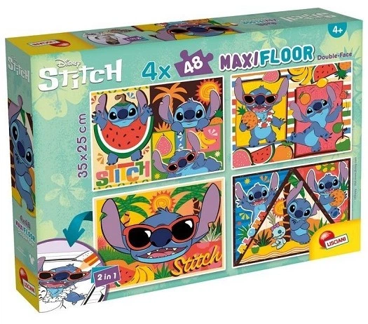 Puzzle Stitch Maxi Floor - 4 x 48 elementów to idealna propozycja dla wszystkich fanów uroczego kosmity. Zestaw zawiera aż cztery układanki po 48 elementów każda, co łącznie daje 192 części do zabawy. Każda z ilustracji przedstawia barwne i radosne scenki ze Stitchem w tropikalnym klimacie – z arbuzem, ananasem, na plaży czy wśród palm. Puzzle są dwustronne: jedna strona to kolorowy obrazek, a druga czarno-biała wersja do samodzielnego pokolorowania, co daje dzieciom dwa razy więcej frajdy i dodatkową przestrzeń na twórczość.