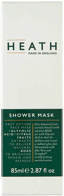 Heath London Shower Face Mask — це кремово-гелева маска для обличчя, призначена для використання в душі, яка м'яко відлущує і оновлює шкіру. Маска очищає шкіру, надає їй сяйва, живить і відновлює, одночасно підтримуючи бар'єр шкіри.