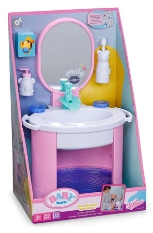Раковина Baby Born з аксесуарами – ідеальне доповнення до щоденних ігор з доглядом за ляльками. Барвистий рожево-білий дизайн з великим дзеркалом і краном дозволяє реалістично мити руки, обличчя та зуби. Після наповнення водою діти можуть натиснути на кран, щоб вода текла, додаючи автентичності грі.