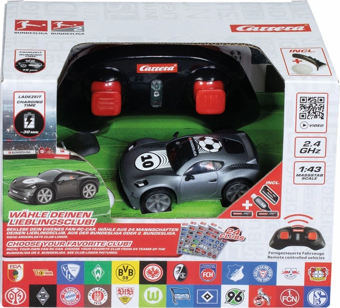 Додатковою принадою є можливість персоналізації автомобіля – у комплекті є наклейки 24 клубів Бундесліги, завдяки чому кожен уболівальник може показати кольори своєї улюбленої команди. Час гри становить до 15 хвилин, а заряджання акумулятора здійснюється за допомогою USB-кабелю, що входить до комплекту, і триває близько 30 хвилин.