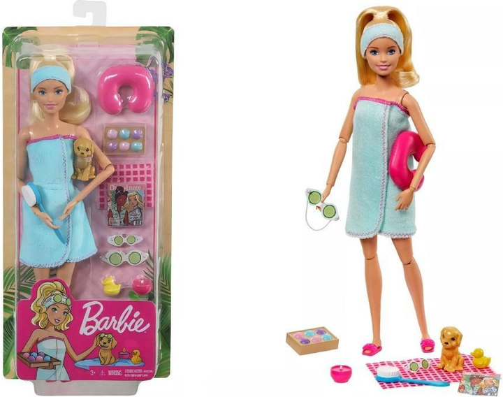 Лялька одягнена у м’який блакитний рушник із рожевою окантовкою, а її образ доповнює пов’язка на голову, що створює атмосферу справжнього релаксу. У комплект входить багато тематичних аксесуарів — від огіркової маски до гумової качечки — усе, щоб зробити гру максимально реалістичною та захопливою.