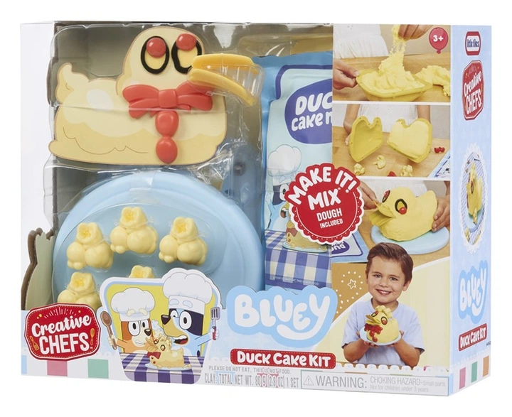 Набір, натхненний кулінарними пригодами Блуї, дозволяє дітям самостійно створити культовий качиний торт, відомий з епізоду серіалу. У коробці знаходяться елементи, які крок за кроком допомагають сформувати чарівну качку – від форми, через очі і дзьобик, аж до характерної червоної бантика. Гра з пластичною масою заохочує до експериментів, місиння і моделювання, завдяки чому приготування тіста стає творчим ритуалом.