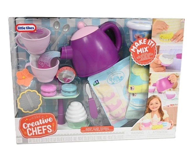 У комплекті є чашки, тарілки, ложечки, чайник і солодкі десерти в пастельних кольорах. Елементи виготовлені з матеріалу, придатного для дітей, і підходять до інших продуктів серії Creative Chefs. Іграшка призначена для маленьких любителів рольових ігор, які люблять організовувати вечірки для домашніх гостей або своїх улюблених ляльок.