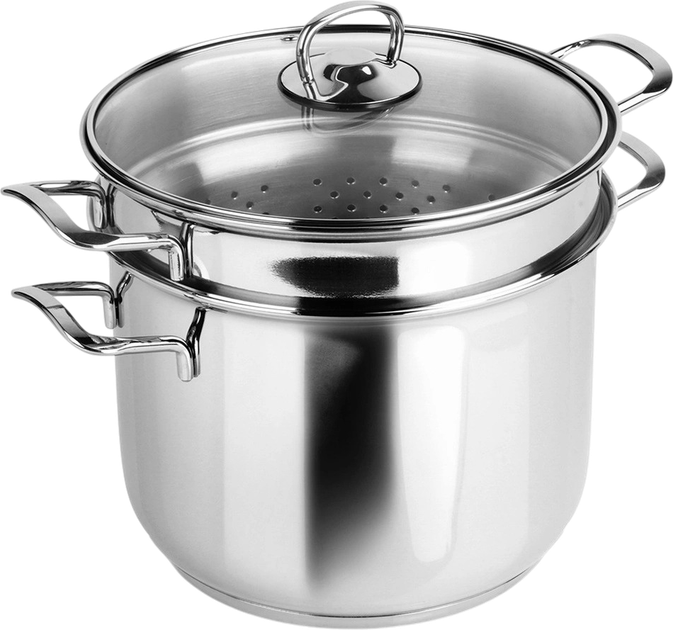 Високоякісний набір для приготування макаронів та овочів у домашній та професійній кухні. Комплект включає сталеву каструлю об’ємом 6 л, вставку для приготування на пару та скляну кришку з нержавіючою рамкою.