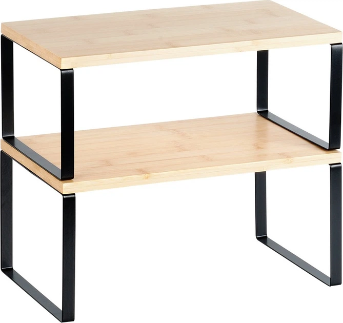 Полиці виготовлені з натурального бамбукового дерева та встановлені на міцній металевій конструкції чорного кольору, що забезпечує стабільність і довговічність. Більша полиця має розміри 33,5 × 19,5 × 16 см, менша — 33,5 × 18,5 × 13,5 см. При розміщенні поруч загальна довжина становить 67 см.