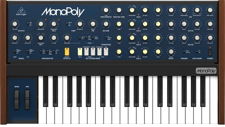 Синтезатор Behringer MONOPOLY — це повноцінна аналогова реконструкція легендарного Korg Mono/Poly 1981 року, створена для музикантів, яким потрібне характерне вінтажне звучання з розширеними сучасними можливостями. Інструмент оснащений чотирма незалежними VCO з класичними хвильовими формами, можливістю детюнінгу, синхронізації та режимами поліфонії, унісону й хордового відтворення, що дозволяє отримувати як щільні баси та соло, так і багатоголосні текстури. Фірмовий 24‑дБ фільтр на транзисторній драбині забезпечує теплий, насичений тон, а секція модуляції з двома генераторами огинаючих і LFO відкриває широкі можливості для створення рухливих тембрів. Вбудований арпеджіатор і секвенсор дозволяють формувати ритмічні патерни без зовнішніх пристроїв, а розширена панель підключень із CV/Gate, MIDI та USB‑MIDI робить синтезатор сумісним із сучасними студійними сетапами та модульними системами. Міцний металевий корпус, інтуїтивна панель керування та автентичний аналоговий характер роблять Behringer MonoPoly універсальним інструментом для створення класичних електронних стилів, експериментальних текстур і живих виступів із виразним вінтажним звучанням.