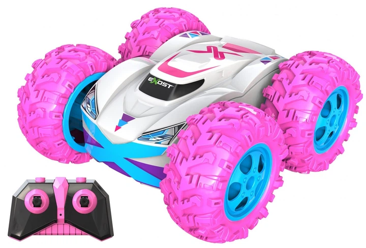 Новий Exost RC 360 Cross Amazone з яскравими рожевими колесами створений для максимального екшену. Цей трюковий автомобіль вміє обертатися на 360°, виконувати перевороти та рухатися з обох боків, перетворюючи кожну поїздку на видовищне шоу. Інтуїтивний пульт керування дозволяє легко контролювати маневри й трюки навіть під час найдинамічнішої гри.