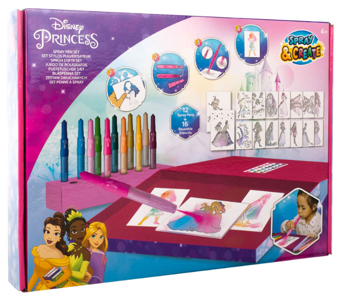 У наборі є фарби-спреї, шаблони з улюбленими принцесами, чисті аркуші та тримач для фарби, який полегшує безпечне та зручне використання. Гра з шаблонами розвиває творчі здібності, уяву та дрібну моторику, а також заохочує експериментувати з кольорами та формами.