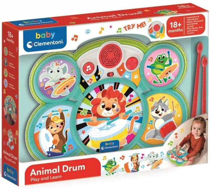 Веселий набір ударних інструментів для гри разом із симпатичними тваринами. З 10 музичними підкладками, 5 різними ударними інструментами та 5 тваринами, яких можна відкрити за допомогою їхніх звуків. Палички додаються і розроблені для дитячих рук. Допомагає розвивати когнітивні здібності, ручну спритність, координацію та розуміння причинно-наслідкових зв'язків.