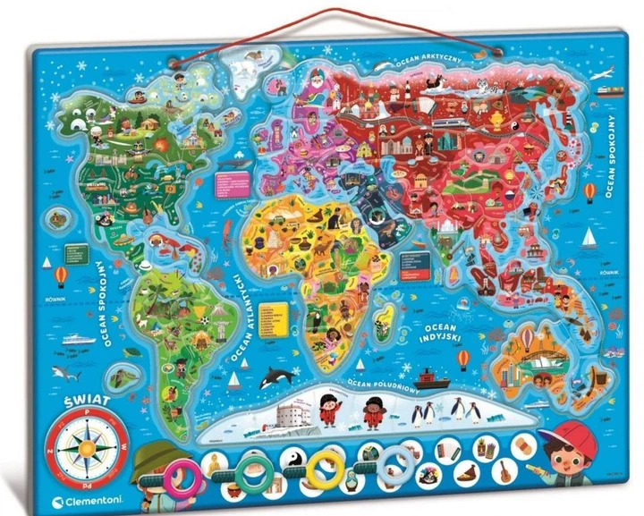 Міцна основа з якісного картону ідеально підходить для гри з магнітами, а зручний шнурок дозволяє повісити карту на стіну — у дитячій кімнаті або навчальному просторі. Гра пропонує подвійний досвід дослідження: це і фізична карта світу, і можливість відтворювати політичну карту, прикріплюючи магніти до відповідних місць.