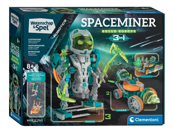 Clementoni Wetenschap en Spel – Space Miner Robotica 3-in-1 Bouwset – це освітній та творчий конструктор, який поєднує елементи гри з вивченням основ робототехніки. Продукт дозволяє побудувати три різні моделі роботів одну за одною, що дає дитині можливість навчатися через практику та поступове ознайомлення з принципами механіки та функціонування рухових систем.