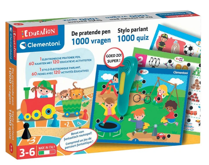 Навчальна гра «Говоряче перо 1000 питань Clementoni» — це інтерактивна навчальна гра, створена для дітей дошкільного та молодшого шкільного віку. Продукт поєднує навчання з розвагою, даючи дитині можливість вивчати літери, цифри, форми, кольори та багато інших понять за допомогою вікторин і завдань, адаптованих до рівня її навичок.