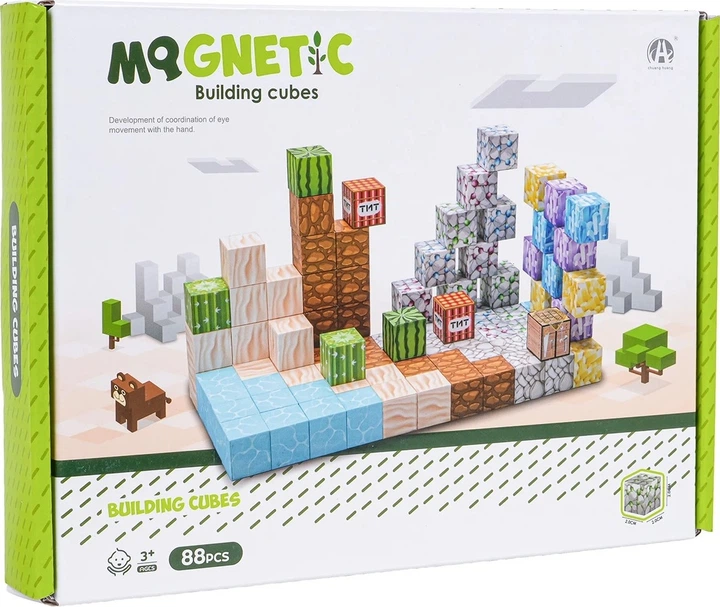 Набір із 88 різнокольорових 3D магнітних кубиків для дітей віком від трьох років. Магнітні кубики виготовлені з найякісніших матеріалів, мають яскраві кольори та пейзажний дизайн. Кубики імітують воду, каміння, пісок та кактуси, що дозволяє будувати різноманітні конструкції. Неодимові магніти дуже міцно утримують деталі разом, створюючи стабільну структуру. Складання блоків один на одного сприяє логічному мисленню та розвиває дрібну моторику дітей.