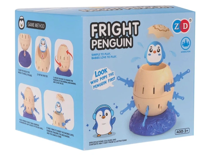 Гра на спритність «Стрибаючий пінгвін» призначена для дітей віком від 3 років. Ця весела гра передбачає розміщення яйця з пінгвіном всередині на основі та натискання на механізм. Потім кожен гравець отримує мечі та вставляє їх один за одним у отвори яйця. Будьте обережні, щоб не вдарити пінгвіна всередині яйця, інакше він вистрибне з яйця, як рогатка. Перший гравець, який вставить усі свої мечі в яйце або більше, ніж його опонент, перш ніж пінгвін вистрибне, перемагає.