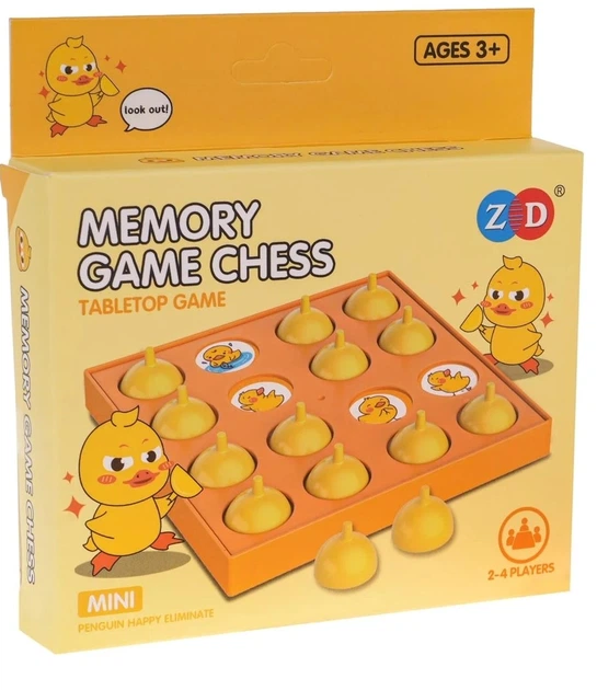 Логічна сімейна гра «Пам’ять» для дітей віком від 3 років та дорослих. Набір складається з дворівневої дошки з отворами у формі кіл та карток із малюнками качок у різних позах. Картка з малюнками кладеться між дошками, а отвори закриваються конусами. Гравці повинні запам’ятати, в якій клітинці знаходиться дана качка. Гравці беруть заданий конус і намагаються знайти ідентичний малюнок. Перемагає гравець, який знайде найбільше пар. Гра вчить терпінню, розвиває пам’ять та концентрацію.