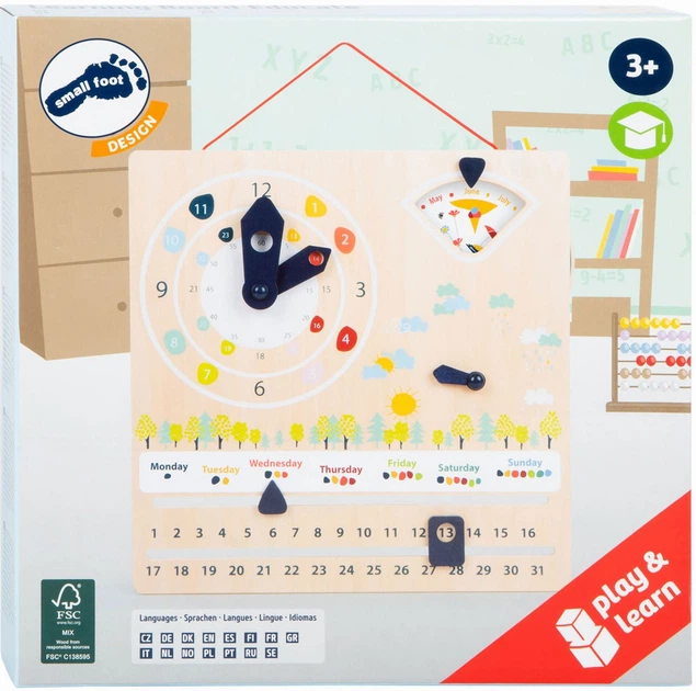 Ця багатофункціональна навчальна панель із FSC®-сертифікованої деревини допомагає дітям легко й наочно опанувати час у 12- та 24-годинному форматах, а також вивчити дні тижня, місяці, пори року та погодні явища. Навчання перетворюється на захопливий щоденний ритуал!