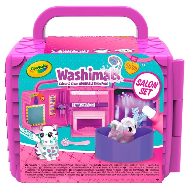 У цьому спеціальному наборі «Салон краси» ти можеш подарувати своїм звіряткам Washimals незабутні процедури догляду. Створи унікальні візерунки на хутрі своїх звіряток за допомогою змивних маркерів Crayola. Для додаткового блиску обприскати тваринок водою з пульверизатора, щоб отримати справжній ефект тай‑дай! Постав свої Washimals перед дзеркалом. Готово? Пора похвалитися ними! Потім їх можна гарно вимити та почистити у ванній частині салону. На завершення звіряток можна покласти під фен і знову розфарбувати!