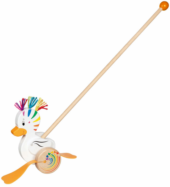 Ця дерев’яна качечка-каталка Лу від Goki виглядає мило, чарівно й трішки «по-особливому». Без сумніву, вона стане ідеальним супутником для дітей під час їхніх перших самостійних кроків у житті. Як жвава дерев’яна іграшка з характером, вона підкорить серця малюків і стане улюбленицею в дитячій кімнаті. Її характерна перевальцем хода з великими гумовими лапками ефектно доповнює й без того унікальний вигляд. Маленька каталка привертатиме здивовані погляди — і цілком заслужено!