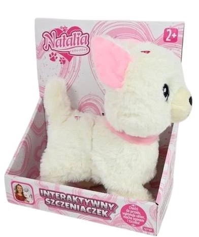 Це м’яке біле цуценя з рожевими вушками швидко стає улюбленим товаришем для ігор. Його доброзичливий вигляд і м’яка шерсть спонукають дітей обійматися, а його реалістичні реакції створюють відчуття гри, ніби він грає зі справжнім собакою. Просто доторкніться до його голови, і він кланятиметься, гавкатиме та вилятиме хвостом, запрошуючи вас приєднатися до нього в розвагах. Поплескування по спині змушує його рухатися вперед, видаючи веселі звуки.