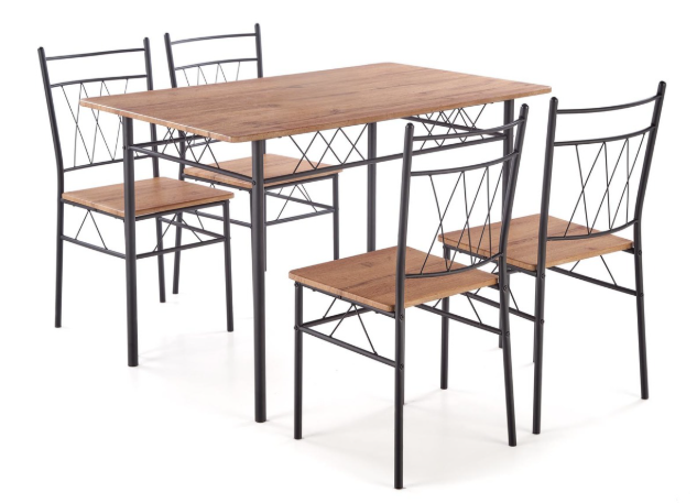 КОМПЛЕКТ Faust стіл + 4 стільці натуральний дуб / чорний - це практичний і стильний комплект меблів для їдальні, призначений для кухні, їдальні та невеликих житлових приміщень. Комплект складається з прямокутного столу класичних розмірів та чотирьох зручних стільців, які забезпечують комфорт під час спільних трапез. Стільниця столу та сидіння стільців виготовлені з ламінованої МДФ-плити з декором натурального дуба, що полегшує догляд за ними та гарантує стійкість до щоденного використання. Каркаси столу та стільців виготовлені з порошкового фарбованого чорного металу, що надає всьому комплекту сучасного, індустріального характеру та стабільності конструкції. Вся конструкція поєднує функціональність з мінімалістичним дизайном, завдяки чому меблі підходять до різних стилів інтер'єру. Продукт вимагає самостійного складання після виймання з упаковки.