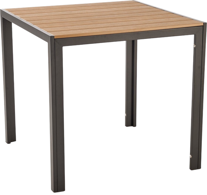 Стільниця коричневого відтінку виготовлена з полістиролу, який характеризується стійкістю до умов експлуатації та простотою догляду. Конструкція підтримується алюмінієвим каркасом чорного кольору, що забезпечує стабільність та сучасний, виразний візуальний контраст.